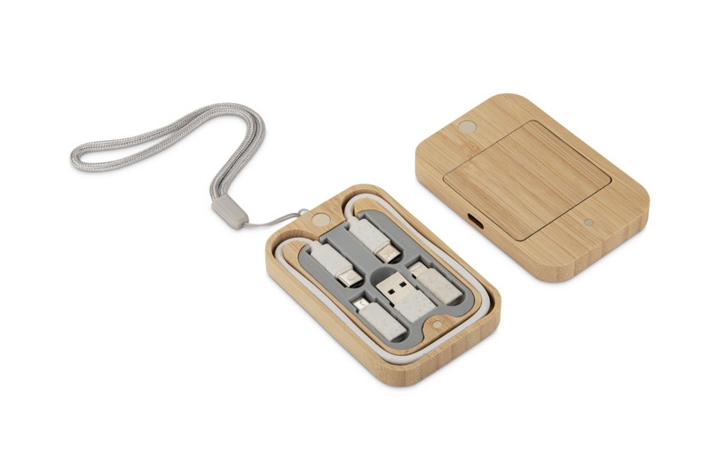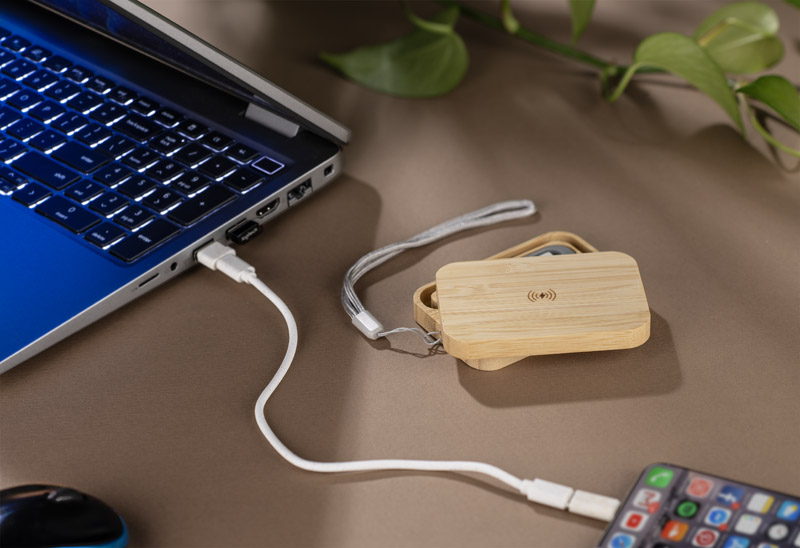 Zestaw kabli BUMO to praktyczne i wielofunkcyjne akcesorium do ładowania, umieszczone w estetycznym etui z bambusa. Oprócz klasycznych kabli, zestaw wyposażono w funkcję ładowarki bezprzewodowej w standardzie Qi Wireless o mocy 10 W, co pozwala wygodnie zasilać kompatybilne urządzenia. Kable wykonane z tworzywa ze słomy pszennej oferują zarówno funkcję ładowania, jak i obsługę przesyłu danych, a wyjście o mocy do 15 W zapewnia szybkie działanie. Dzięki złączom USB-C zestaw sprawdzi się w przypadku większości nowoczesnych urządzeń mobilnych. Kompaktowe etui ułatwia przechowywanie i transport, dzięki czemu BUMO idealnie nadaje się do codziennego użytku w biurze i w podróży. Możliwość znakowania sprawia, że to również ciekawy gadżet reklamowy z praktycznym zastosowaniem.
