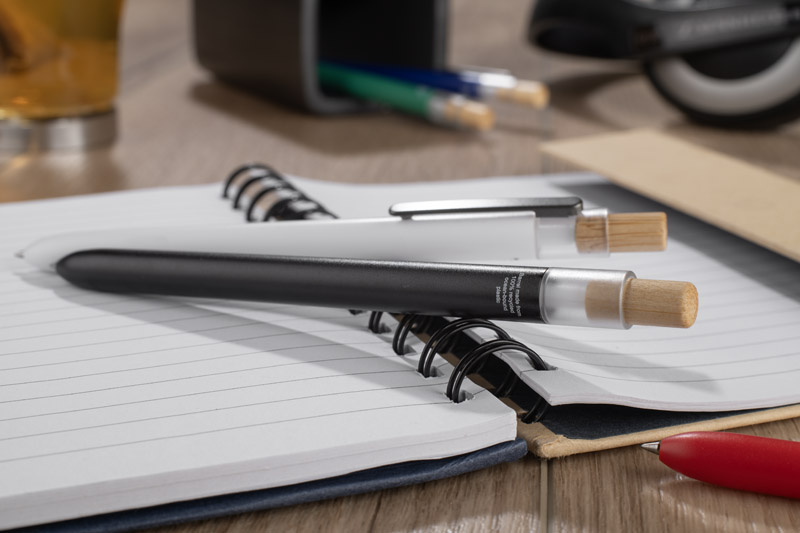 Długopis OCEANO wykonany jest z materiału pochodzącego z odpadów ocean bound – tworzyw zbieranych z terenów przybrzeżnych, zanim trafią do mórz i oceanów. Posiada lakierowany korpus, bambusowy przycisk oraz metalowy klips, co nadaje mu nowoczesny wygląd i przyjemne w użytkowaniu wykończenie. Automatyczny mechanizm ułatwia codzienną obsługę, a wkład typu G2 z żelowym tuszem o grubości pisania 0,5 mm zapewnia płynny i precyzyjny zapis.