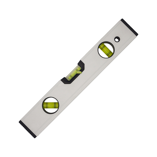 Aluminiowa poziomica o długości 30 cm wyposażona w magnetyczną podstawę oraz 3 libelle pomiarowe: 0˚, 90˚ i 45˚.