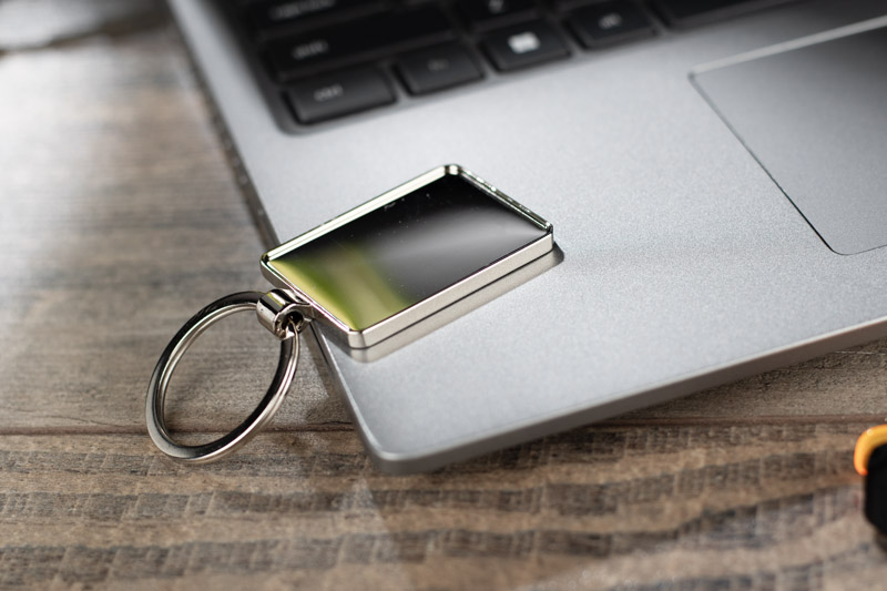 MOTI to prostokątny brelok wykonany z wysokiej jakości metalu, zaprojektowany z myślą o usłudze znakowania metodą doming. Dzięki tej technologii, możliwe jest precyzyjne naniesienie logo firmy w formie estetycznej naklejki żywicznej, która tworzy efekt zbliżony do trójwymiarowego obrazu.