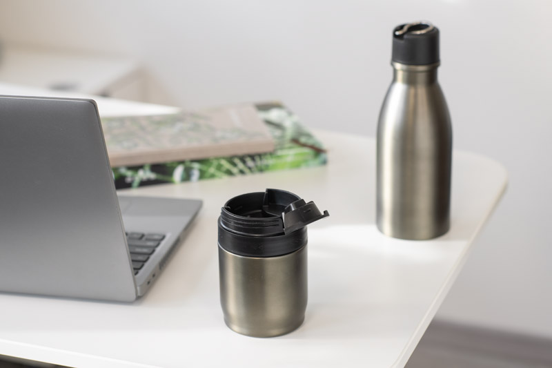 Butelka termiczna ze stali nierdzewnej DRINNO o pojemności 500 ml. Składa się z dwóch elementów (komór), które można rozdzielić i używać niezależnie: górna część to butelka termiczna z zakrętką wyposażoną w składany uchwyt, a dolna część to odkręcany kubek termiczny z pokrywką zamykaną na zatrzask. Całość tworzy funkcjonalne rozwiązanie na ciepłe i zimne napoje – idealne do pracy, podróży lub jako praktyczny upominek reklamowy.