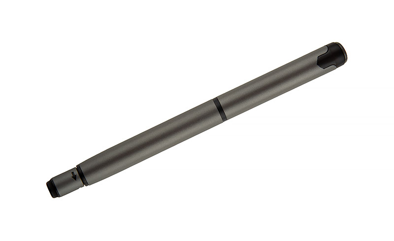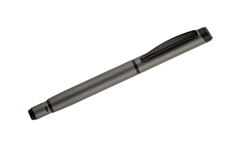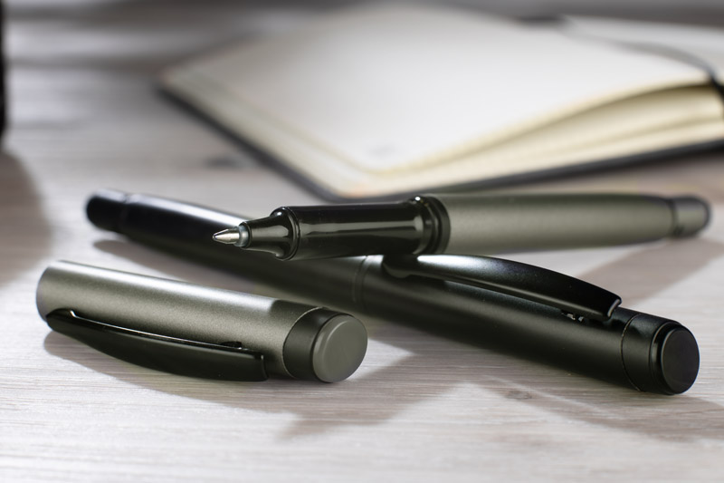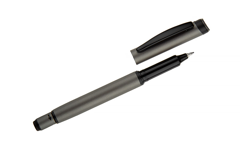 Długopis ROTIS to aluminiowy model z żelowym wkładem typu free ink, zamykany klasyczną zatyczką. Korpus o półmatowym wykończeniu uzupełnia czarny, metalowy klips, który dodaje elegancji. Obrotowa końcówka z wbudowanym spinnerem pełni funkcję antystresową – umieszczona na niej czarna strzałka, wytłoczona w materiale, subtelnie sugeruje kierunek obrotu.