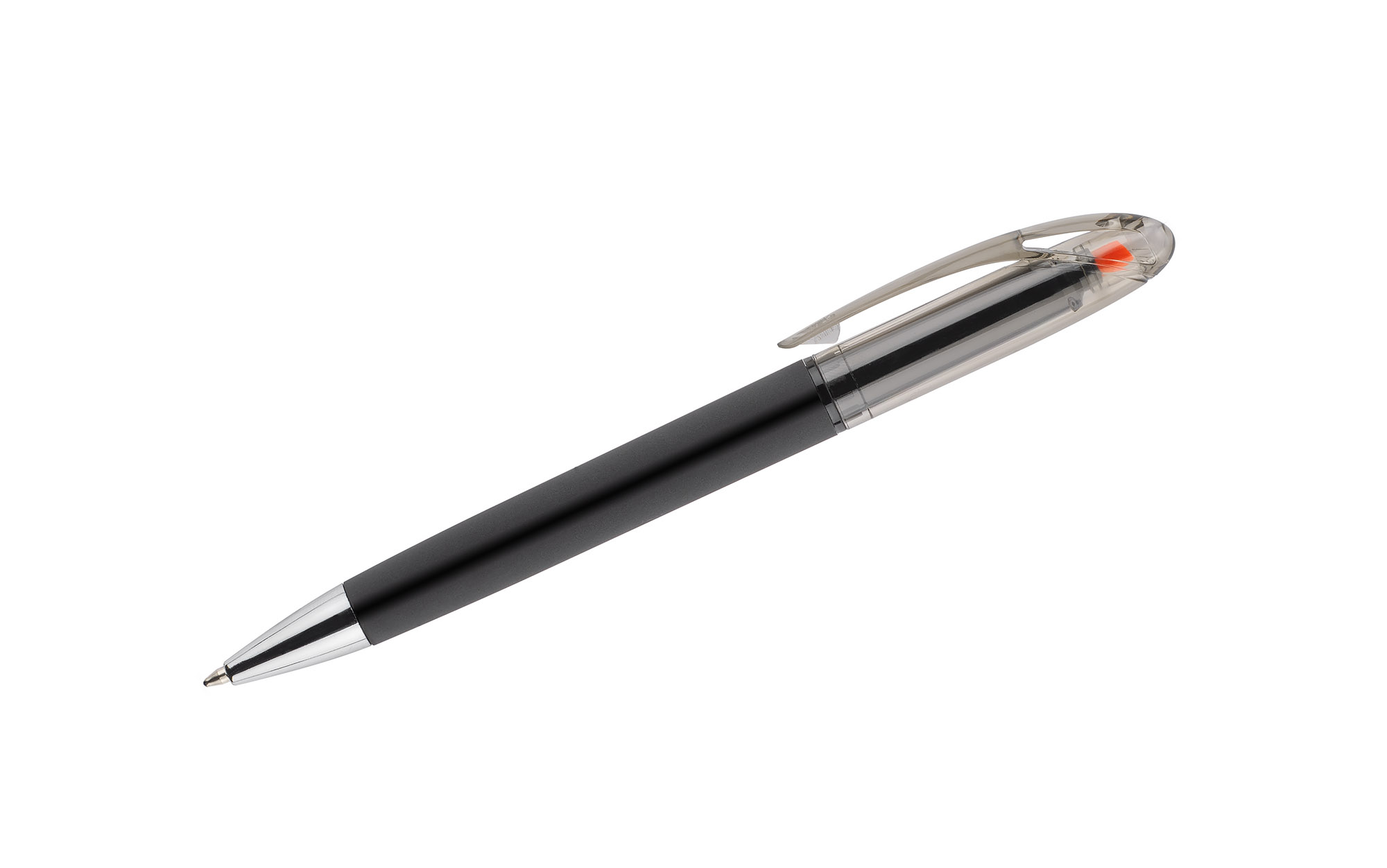 Ten innowacyjny gadżet pozwala na wygodne korzystanie zarówno z długopisu, jak i zakreślacza, dzięki czemu z łatwością zaznaczysz najważniejsze informacje. Gumowa powłoka korpusu zapewnia niezwykły komfort pisania, a mechanizm typu twist oraz niebieski wkład długopisu gwarantują wygodę użytkowania.