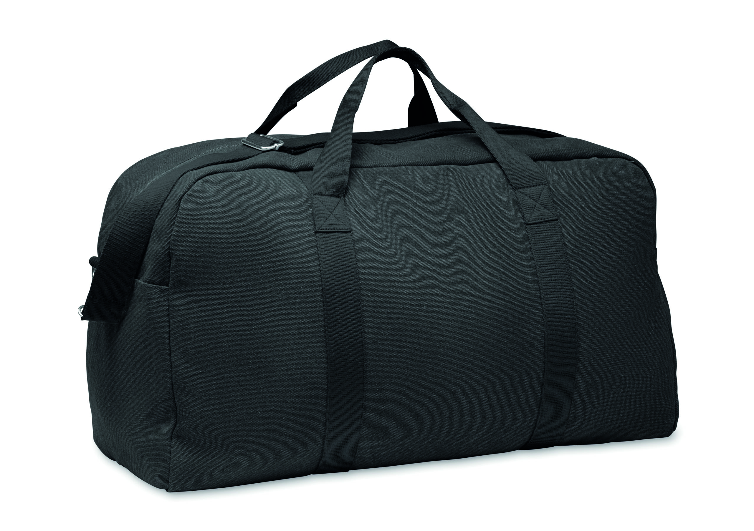 Torba podróżna Duffle wykonana z materiałów pochodzących z recyklingu o gramaturze 450 gr/m² (60% bawełna z recyklingu i 40% poliester z recyklingu) z regulowanym i odpinanym bawełnianym paskiem.