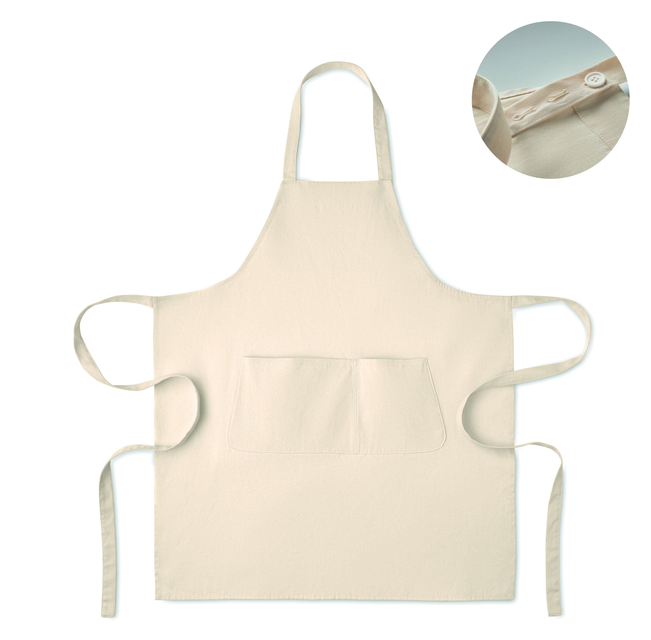 Regulowany fartuch z 1 dużą kieszenią z przodu i 2 przegrodami z bawełny organicznej 240 gr/m². Regulowany guzik na pasku na szyję. Ten produkt posiada certyfikat OEKO-TEX® STANDARD 100.