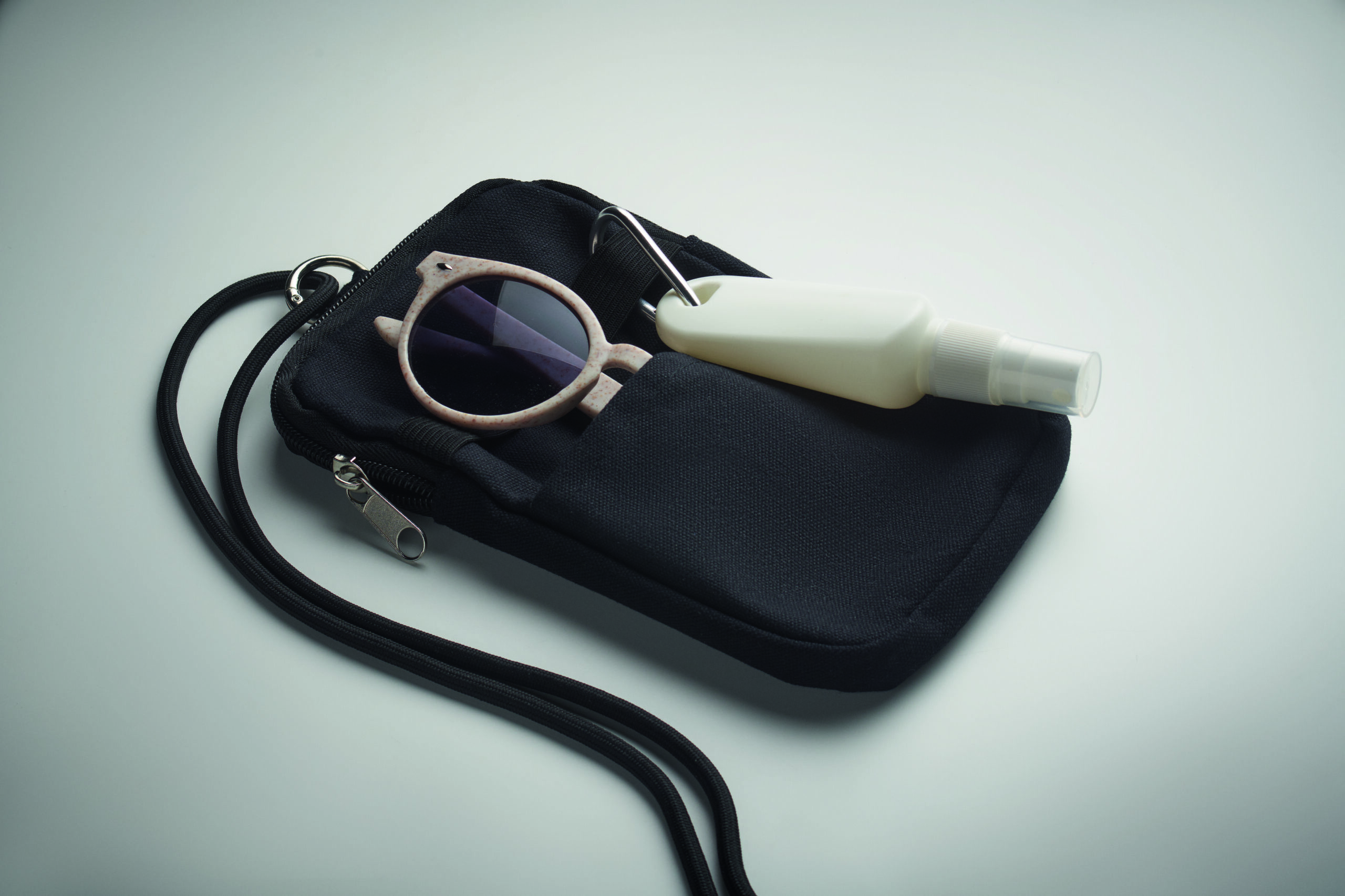 Torba na smartfon z recyklingowanej bawełny z regulowaną smyczą z poliestru RPET i otwartą kieszenią z przodu. 280 gr/m².