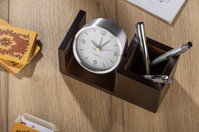 Ten metalowy zegar z budzikiem i dużą białą tarczą, zamocowany na solidnej drewnianej podstawce, to nie tylko ozdoba, ale także praktyczny element wyposażenia biurowego. Dodatkowy pojemnik na artykuły biurowe sprawia, że NUTTO jest niezastąpionym gadżetem reklamowym z logo Twojej firmy.