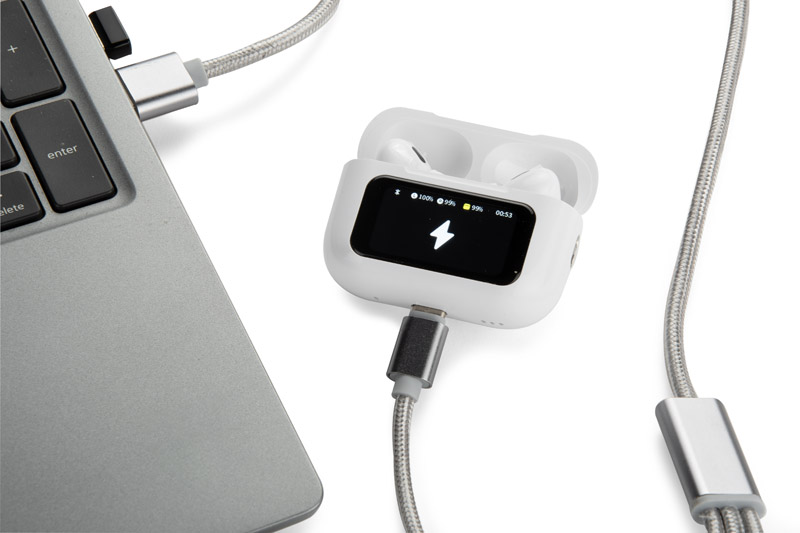 Słuchawki bezprzewodowe SENSIFY o nowoczesny gadżet premium, który łączy funkcjonalność słuchawek dousznych z zaawansowanym etui wyposażonym w kolorowy, dotykowy wyświetlacz. Pozwala on na sterowanie głośnością, aktywację redukcji hałasu (ANC/ENC), przełączanie w tryb dźwięku otoczenia (ambient) oraz podgląd poziomu naładowania. Słuchawki zapewniają do 4 godzin pracy, a etui o pojemności 300 mAh umożliwia ich wielokrotne ładowanie. Urządzenie łączy się ze smartfonem przez Bluetooth i obsługuje sterowanie dotykowe. Produkt zapakowany jest w estetyczne, minimalistyczne pudełko w stylu premium. Ładowanie odbywa się przez USB-C (kabel nie jest dołączony do zestawu).
