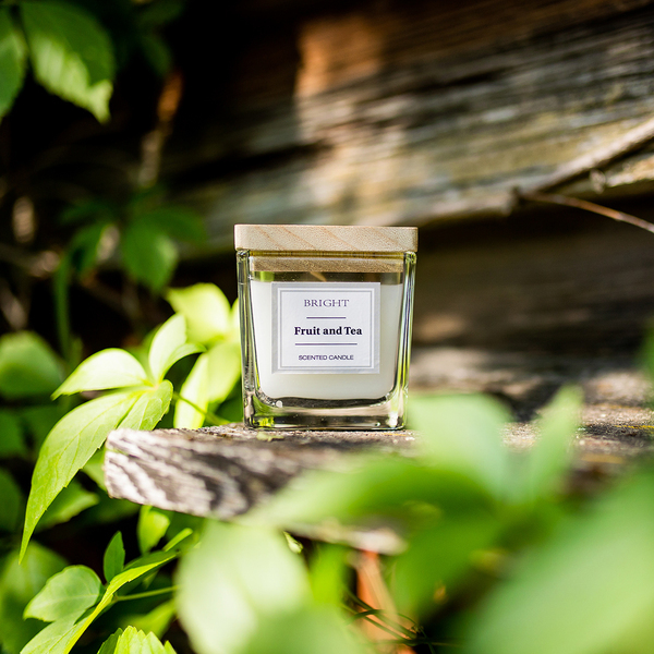 Świeca zapachowa w szkle, z elegancką drewnianą pokrywką, rozprowadza aksamitny zapach zimowych owoców i herbaty, tworząc wyjątkową atmosferę.