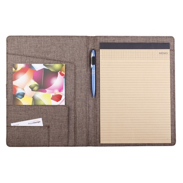 Teczka konferencyjna A4 w lnianej okładce. W środku notes w linię z papieru z recyklingu, 20 kartek 70 g/m². Kieszeń na dokumenty A4 i dwie dodatkowe kieszenie, uchwyt na długopis. Długopis nie jest dołączony.